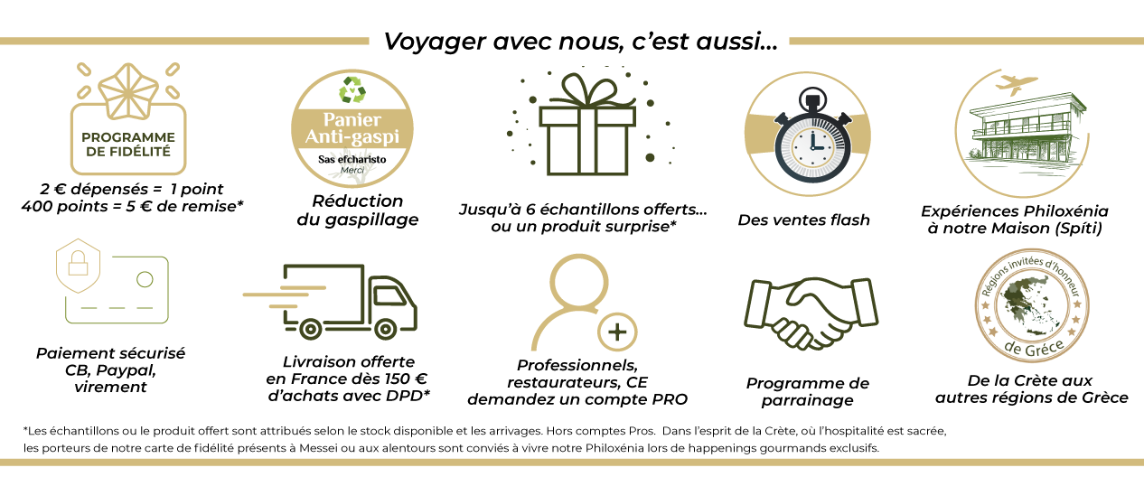 carte de fidelité GRECE CENTRALE prix en baisse Livre regime crétois Producteurs Blog Le Prestige Crétois, entreprise rurale de l'Orne - Normandie, propose une sélection de produits crétois et grecs authentiques.Bienvenue sur Le Prestige Crétois, votre épicerie grecque en ligne spécialisée dans les produits grecs et crétois authentiques. Depuis la Normandie, nous sélectionnons avec soin les meilleurs producteurs de Crète et de toute la Grèce pour vous offrir une expérience culinaire méditerranéenne unique. Découvrez notre large choix de huiles d’olive de Crète d’exception, nos olives Kalamata, nos miels grecs artisanaux, nos herbes et épices naturelles, ainsi que nos spécialités sucrées et salées. Tous nos produits grecs sont sélectionnés pour leur qualité, leur authenticité et leur respect des traditions familiales. Que vous soyez passionné de gastronomie, amateur de produits crétois ou simplement curieux de découvrir les saveurs de la Méditerranée, Le Prestige Crétois est votre partenaire privilégié. Profitez d’une livraison rapide depuis la France et savourez le meilleur de la Crète et de la Grèce à votre table. Nous travaillons en collaboration avec des marques réputées telles que Meligyris,Papadopoulou, Dodoni, Mastihashop, Creta Carob et bien d’autres artisans locaux. Explorez notre épicerie fine grecque, découvrez nos huiles d’olive grecques et nos douceurs traditionnelles — des produits méditerranéens d’exception à portée de clic. ![]() 32,40 EUR (-7,72%) 29,90 EURkalos irthate "bienvenue" à la maison "spiti" du Prestige Crétois à MesseiDécouvrez l’univers du Prestige Crétois : un espace chaleureux où vous trouverez nos meilleurs produits crétois, sélectionnés avec passion.