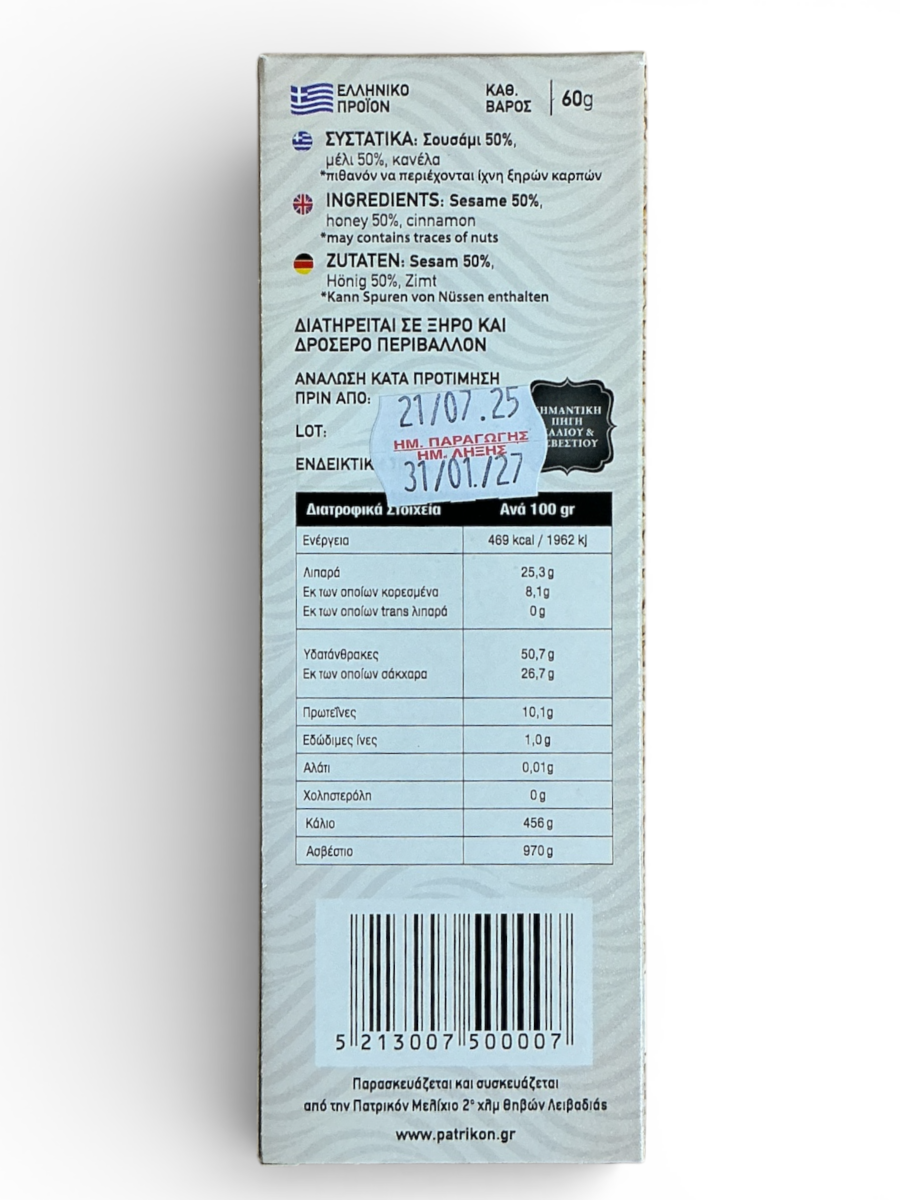 Barre de sésame "Pasteli" au miel et à la cannelle PATRIKON 60 g