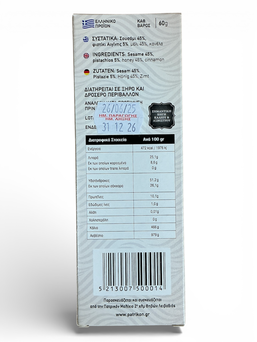 1. COMPOSITION : Sésame 45 %, miel 45 %, pistaches d’Aegina AOP 5 %, cannelle. Sans sucre ajouté, sans additifs, sans conservateurs.