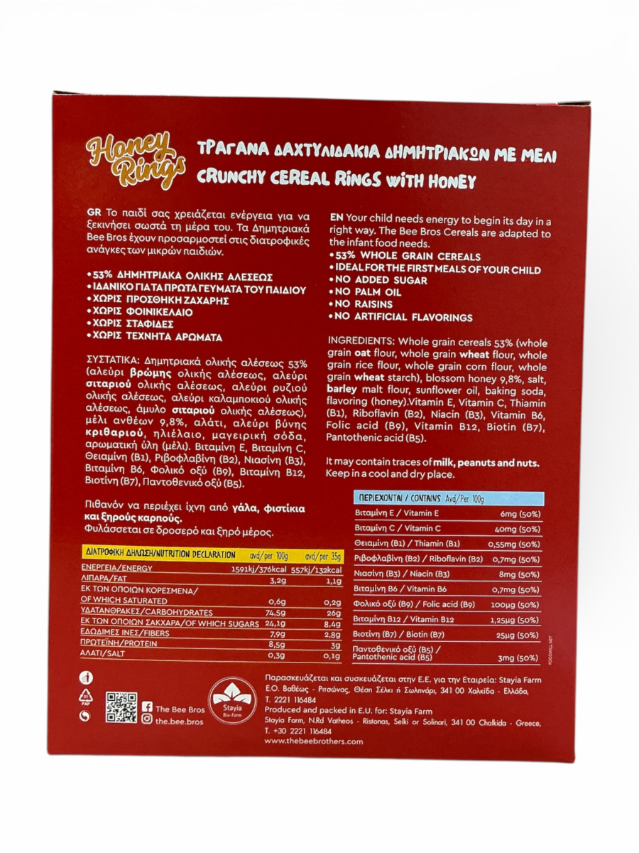 3. Les céréales Honey Rings de THE BEE BROS sont fabriquées en Grèce à partir de céréales complètes locales et de miel pur. Conçues pour offrir une alternative plus saine aux céréales industrielles, elles ne contiennent ni sucre ajouté ni huile de palme. Leur recette équilibre énergie, fibres et vitamines pour bien démarrer la journée, dès 12 mois.