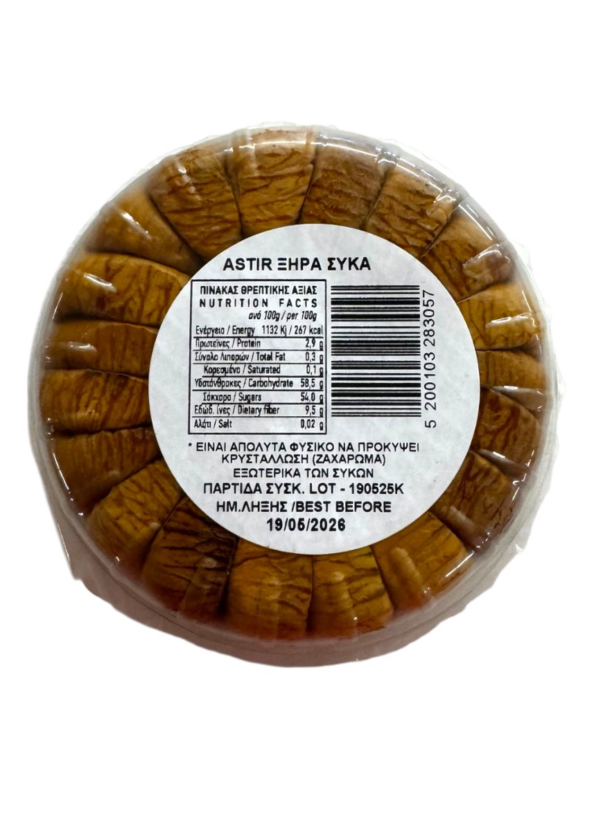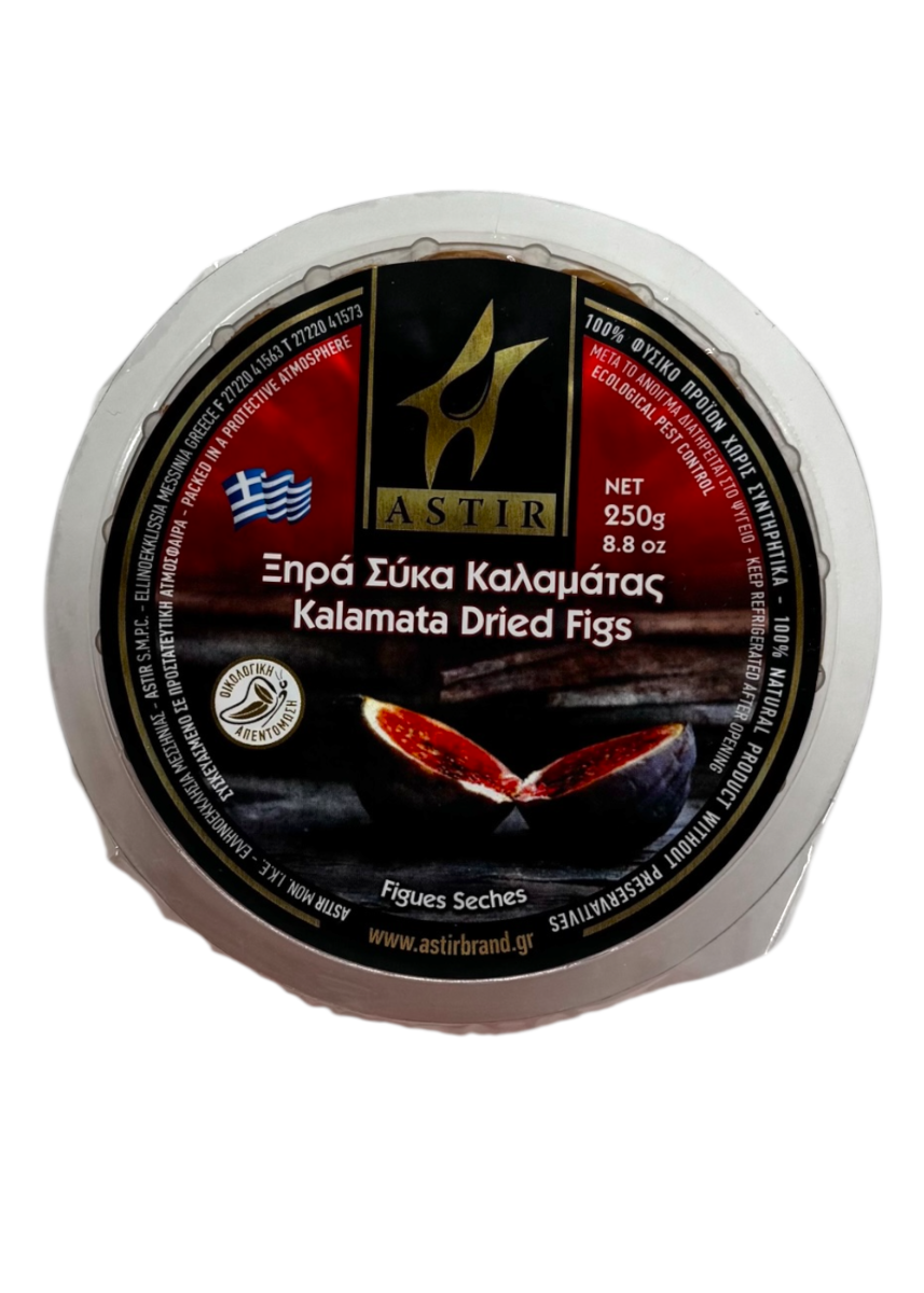 Figues sèches authentiques de Kalamata, produites par ASTIR. Récoltées sous le soleil du Péloponnèse, elles sont naturellement sucrées et moelleuses, sans additifs ni conservateurs.
