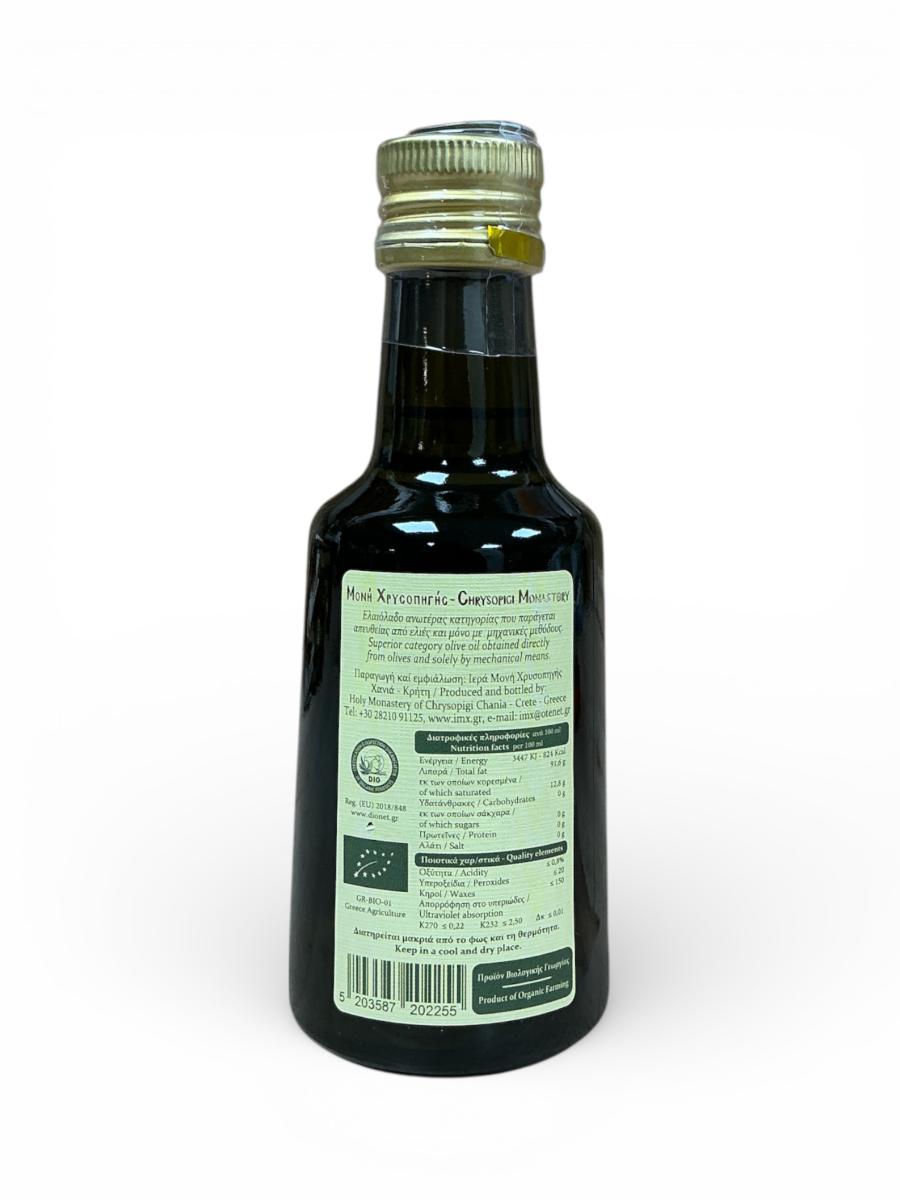 L’huile d’olive biologique du Monastère est d’une qualité irréfutable et peut être commandée et envoyée en Grèce et à l’étranger. Les oliveraies de Chrysopigi comprennent des oliviers séculaires d'olive tsunati, la deuxième plus ancienne variété d'olive à huile. La fraternité actuelle  du monastère a enrichi les cultures d'oliviers Koroneiki, la variété la plus répandue pour la production d'huile d'olive en Grèce. L'huile d'olive particulièrement délicate et aromatique de l'olive Koroneiki est parfaitement combinée avec l'huile d'olive spéciale, robuste et de qualité exceptionnelle de Tsounati, pour donner l'huile d'olive biologique extra vierge unique du monastère de Chrysopigi.