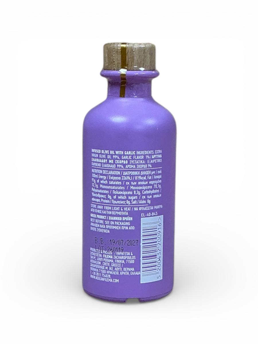 Une huile d’olive crétoise délicatement parfumée à l’ail, idéale pour relever les plats du quotidien.