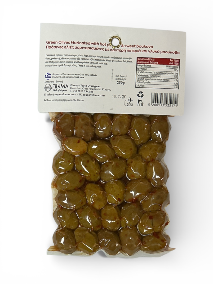 Ces olives, appelées prasine? elies marinismenes me kafteri piperia kai glyko boukovo en grec, présentent une couleur vert clair brillante, une texture ferme et une saveur relevée, soutenue par des notes épicées typiques de la cuisine grecque.