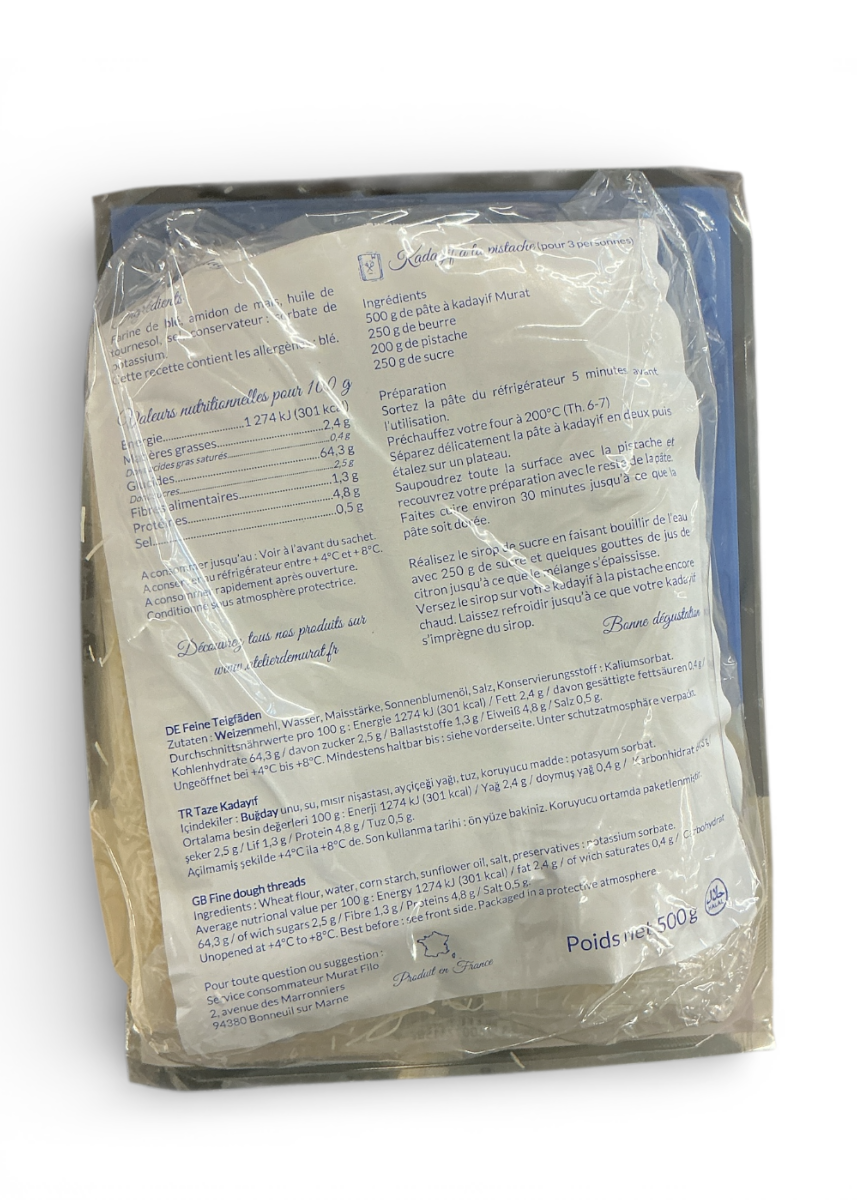 La pâte à kadayif Murat, aussi appelée cheveux d’anges, est une pâte très fine en filaments, utilisée pour les desserts orientaux et méditerranéens.