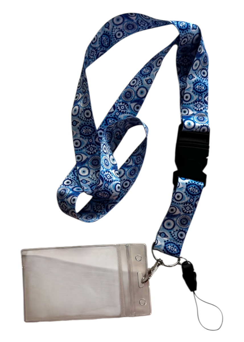 Porte-carte pratique et élégant avec lanière décorée du célèbre motif grec « œil bleu » (mati), symbole de protection et de chance. Parfait pour les cartes de transport, badges d’entreprise ou cartes de conférence.